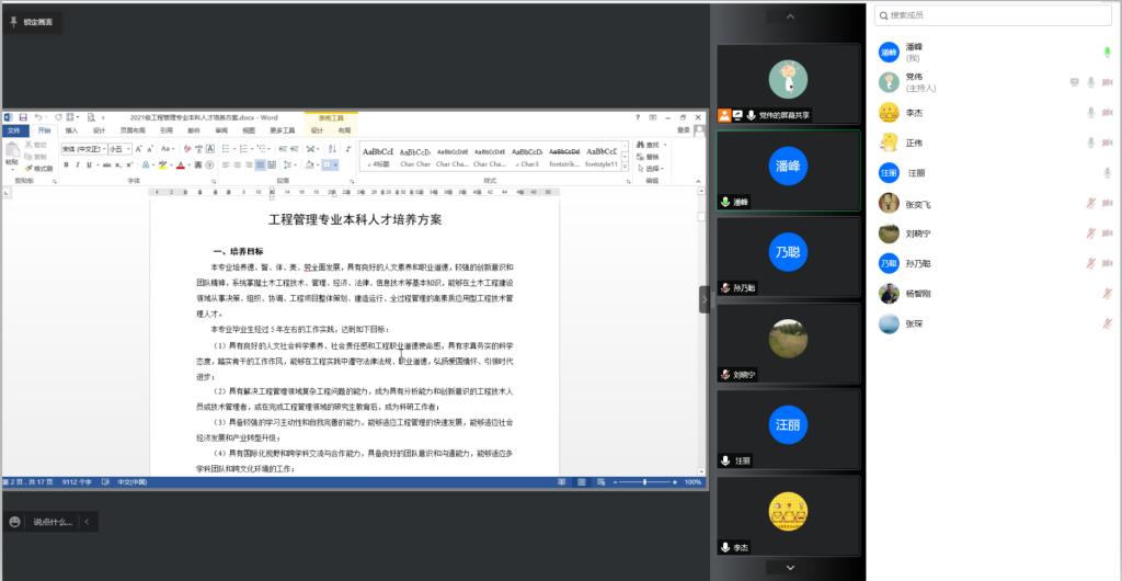 按照学校教务处对本科人才培养方按提出的修订要求,建筑教研室于5月7日上午9:00通过腾讯会议组织开展了2023级工程管理专业本科人才培养方案修订线上研讨会,会议由工程管理专业负责人党伟主持,建筑教研室全体教师参加。