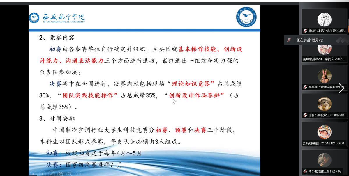 5月12日下午16:00建环专业负责人杜芳莉通过腾讯会议举办了2022年中国制冷空调行业大学生科技竞赛知识普及讲座。本次讲座从学科竞赛简介、专业创新思维分析、创新能力提升策略、学科竞赛经验分享等方面进行展开。