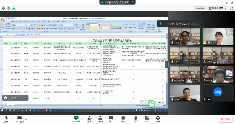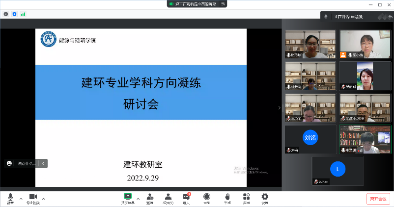 为加强学科建设,提高科研水平。9月29日20:00-22:00点,建环教研室采用视频会议方式,召开了建环专业学科方向凝练研讨会,会议由教研室主任范小苗主持,专业负责人杜芳莉老师主讲,建环教研室全体专任教师参会讨论。