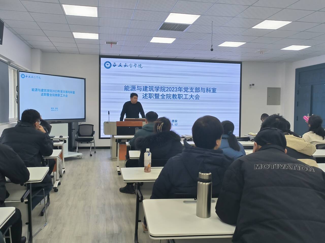 为全面总结学院2023年度工作开展情况,促进总结思考,更好谋划2024年度工作,能源与建筑学院在教学主楼9楼智慧教室召开党支部书记及科室主任述职会。学院领导班子、各专业负责人、党支部书记、科室主任以及全院教职工参会。会议由党总支书记曹国震主持。