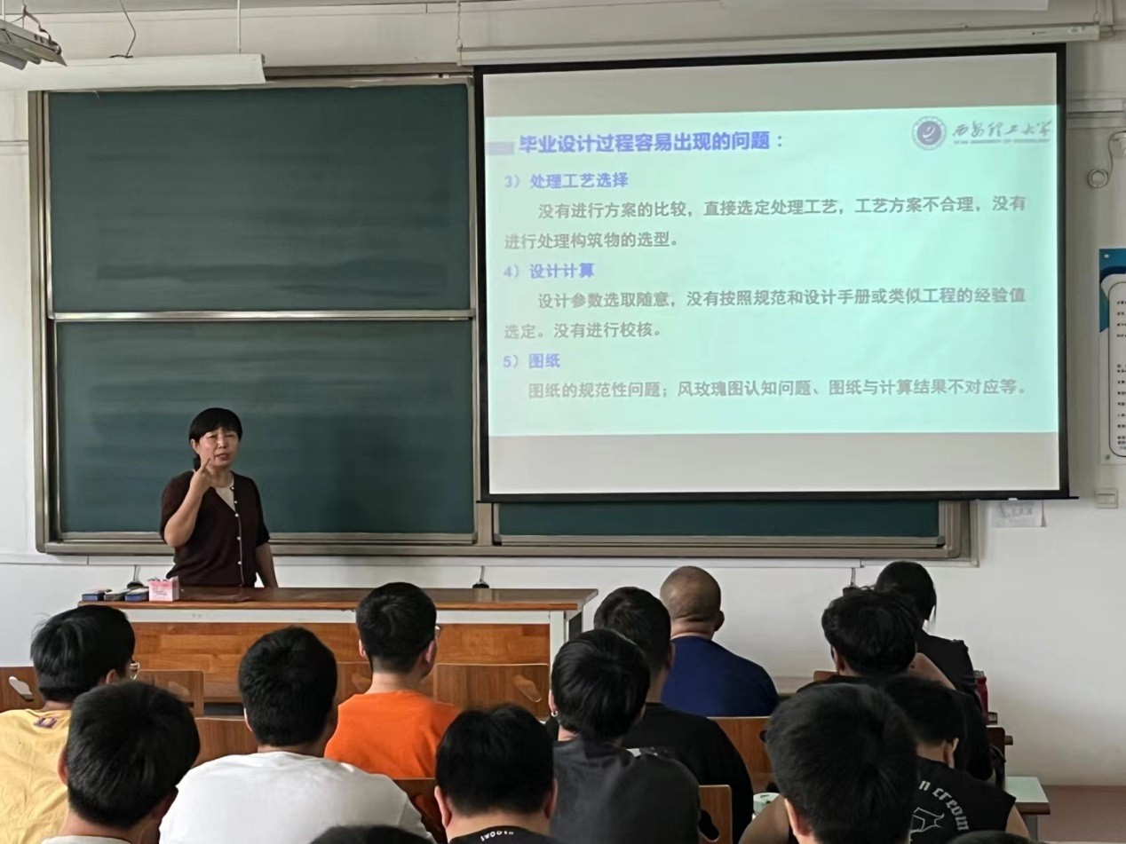 为提高2024届给排水科学与工程专业毕业生毕业设计(论文)的质量,4月23日给排水教研室在阎良校区阎教1230教室召开毕业设计工作过程及案例分析培训讲座。邀请了西安理工大学给排水科学与工程专业马霞老师给排水教研室全体教师和大四毕业生参加。会议由教研室主任沈哲主持。