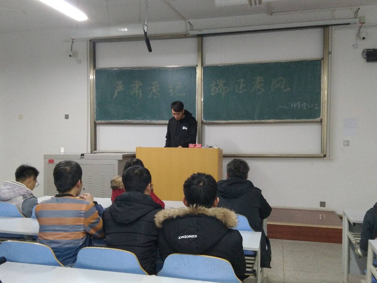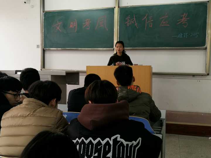 为全面贯彻落实学校有关文明考风的相关要求,12月14日晚,我院2016级学生召开了以诚信考试,文明考风为主题的班会,本次班会由各班班长主持。