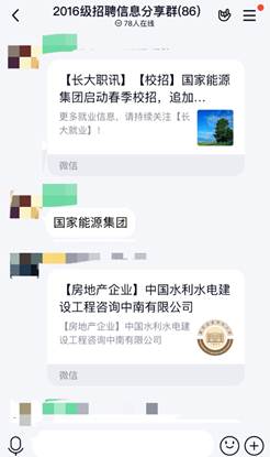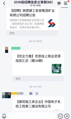 疫情防控期间,我院负责就业辅导员大力开展线上招聘会的信息分享工作,通过成立学生就业信息分享小组、未就业学生信息共享群,每天按时搜集并为同学们分享各类高质量网络招聘会信息,促进了我院2020届毕业生的就业工作,为使同学们早日找到心仪工作而努力。