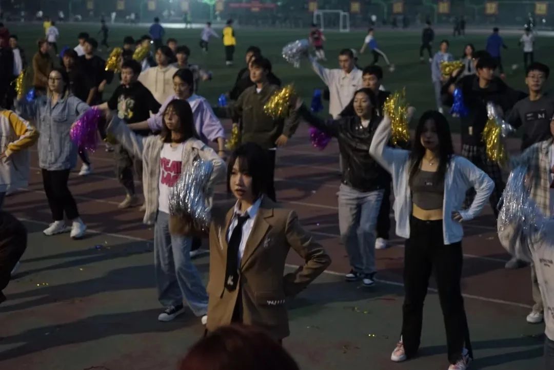 月光洒下,给排水202班肖陶瑜,田野,工管211班孙合翔,及工管212班王倩等学生干部,以身作则,与各位同学一同手臂转起,步伐向前,花球挥动,汗水挥洒,训练学习,在正式表演时穿上厚重的玩偶服,与观众亲密互动,似火的骄阳却也无法阻挡他们随音乐舞动的身影。