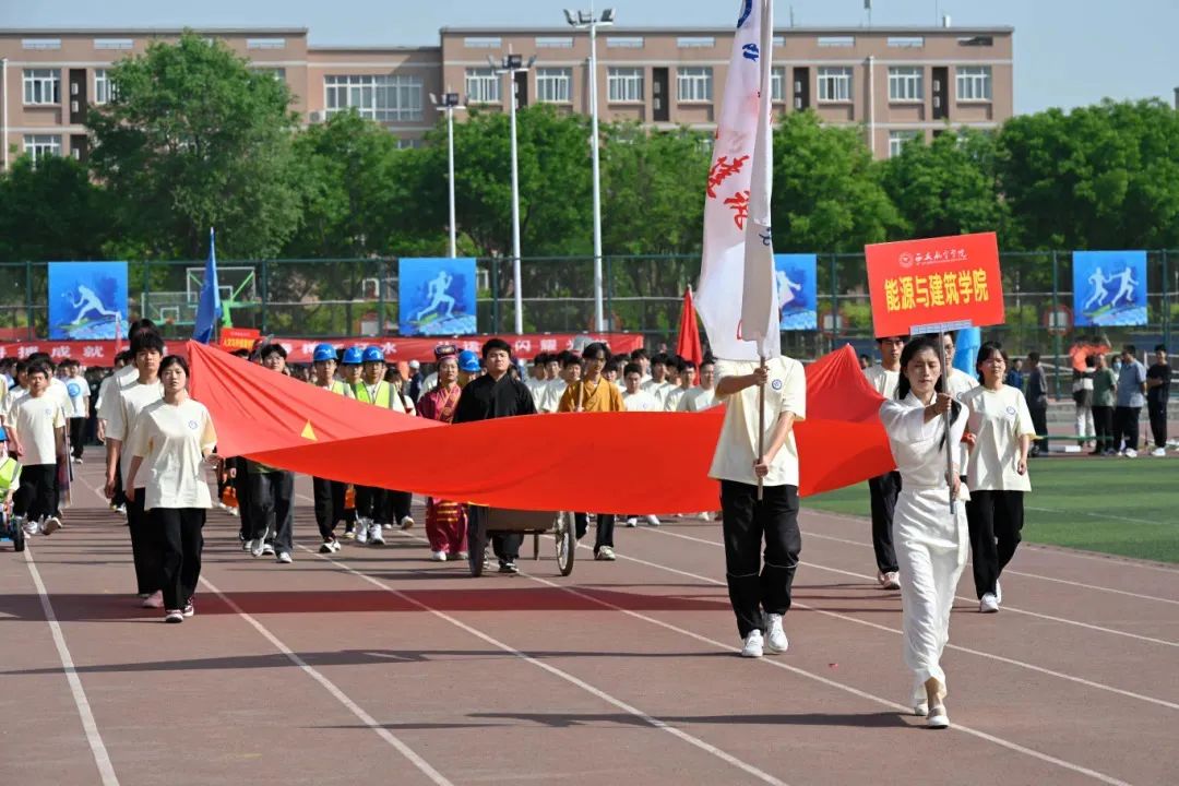 开幕式上,随着激昂的乐曲响起,各学院方阵依次入场。能源与建筑学院的学子们身穿米白色的衣服,步伐坚定,目光坚定,脸上洋溢着自信与骄傲。他们代表着学院的荣誉和力量,展现着学院的风采和特色,用自己的行动诠释着青春的力量和奋斗的精神。