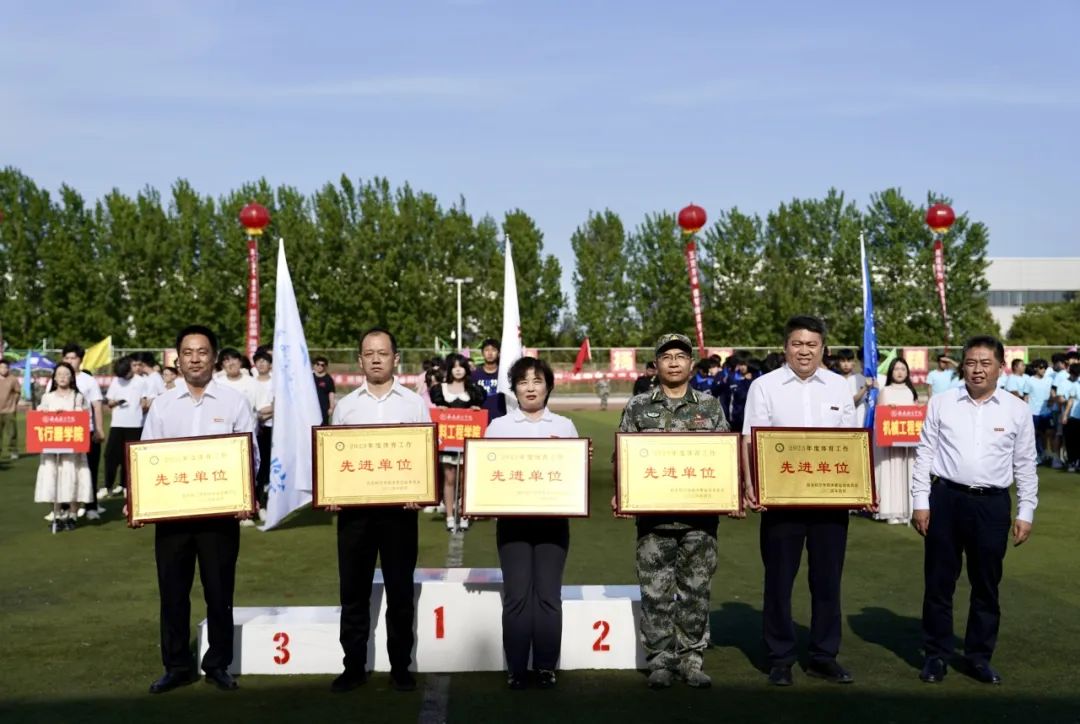 闭幕式上,各学院排着整齐有序的方阵,抬头挺胸地站在操场中央。在运动场上挥洒汗水的全体师生,用行动诉说了心中坚定的信念。运动会主持人宣布了优秀学院及团体获奖名单。本次运动会能源与建筑学院不惧挑战荣获了三个奖项,分别是优秀组织奖、教职工团体甲组第三名、先进单位,取得了良好的成绩。台上领导依次为获奖团队颁发奖牌。