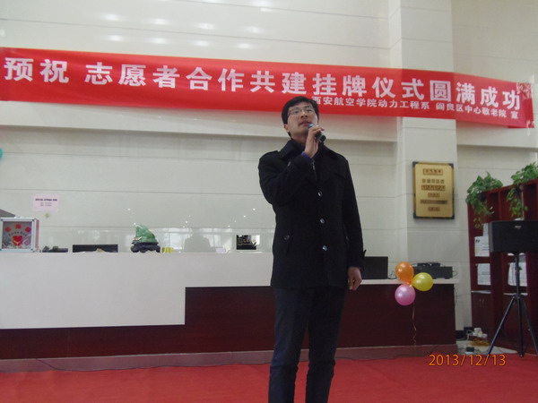 12月13日,动力工程系团总支在阎良区中心敬老院举行志愿者服务基地挂牌仪式。阎良区民政局局长谢利远、办公室主任叶小梅,校团委组织部部长张鹏,系团总支书记阎静及部分志愿者代表参加。