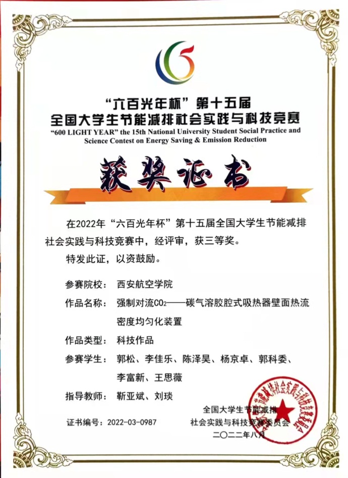 受疫情影响,响应减少聚集性活动倡议,5月18日在线上举行了校赛路演,经过赛前筛选,总计有六支队伍参加校赛路演,决出校赛一二三等奖。国赛采取线上报名方式进行,我校共计有三支队伍线上参赛,每支队伍配有专业指导教师,对参赛作品进行了精心打磨,制作了精美模型及展示视频。经过专家会审评比,教师靳亚斌指导项目—“强制对流CO₂-碳气溶胶腔式吸热器壁面热流密度均匀化装置”获得国家级三等奖。