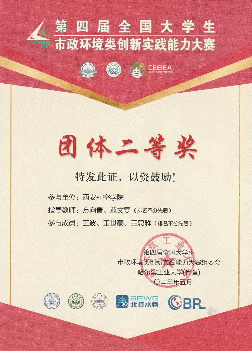 近日,由哈尔滨工业大学、同济大学和生态环境产教联盟共同主办的第四届全国大学生市政环境类创新实践能力大赛圆满落幕,我校王波、王世、王思雅三位同学组成的西航飞跃队荣获团体二等奖的优异成绩。