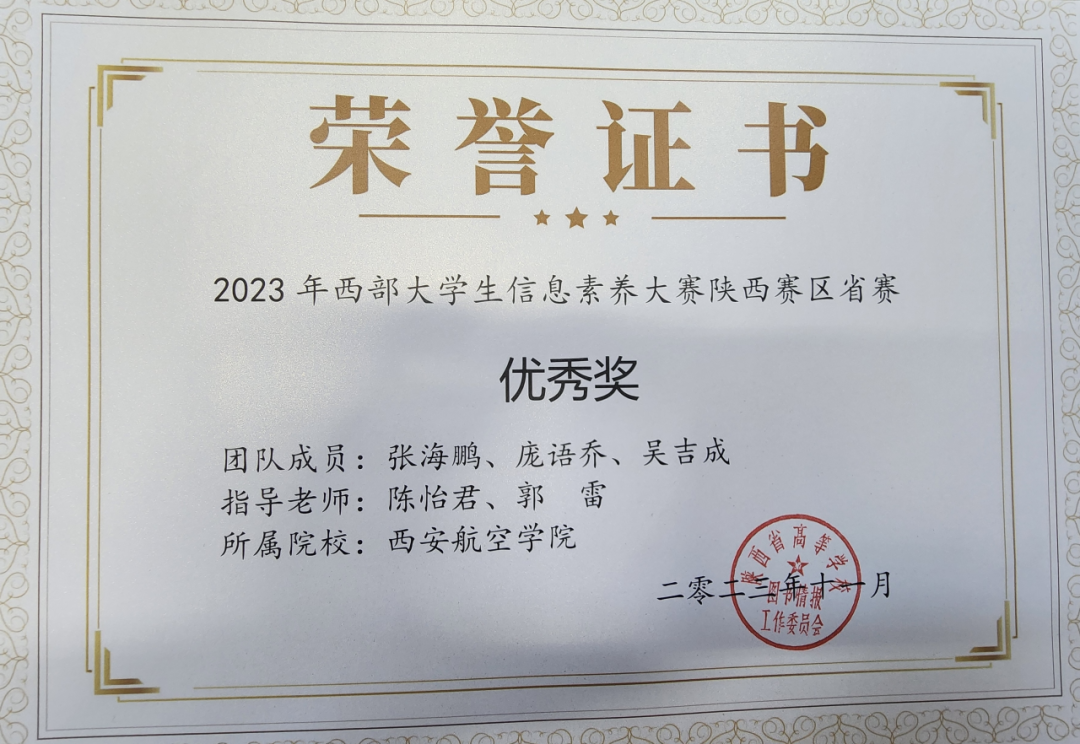近日,2023年西部大学生信息素养大赛陕西赛区省赛圆满落幕。能源与建筑学院给排水科学与工程211张海鹏、给排水科学与工程211吴吉成及其团队成员在陈怡君、郭雷两位老师的指导下获得优秀奖。